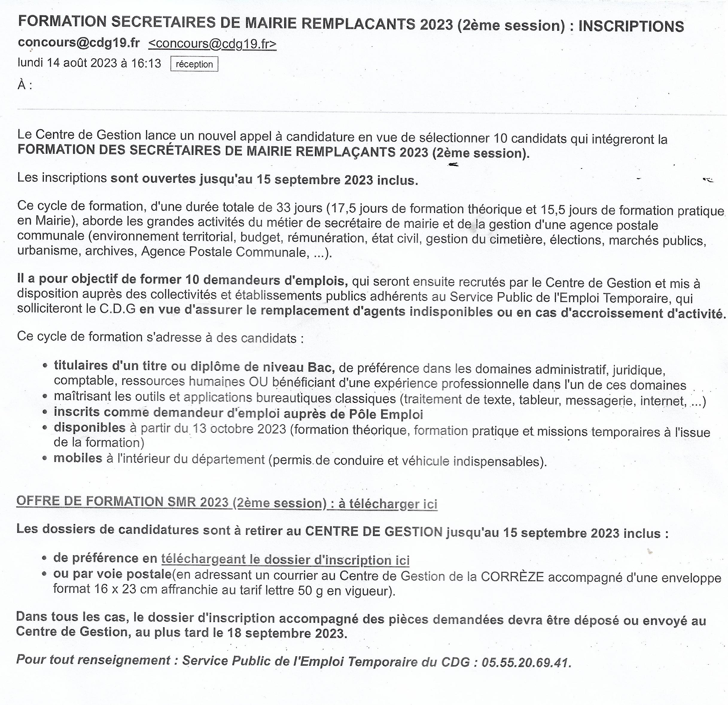 Le Centre de Gestion lance un nouvel appel à candidature en vue de sélectionner 10 candidats qui intégreront la formatin des secrétaires de mairie remplaçants 2023.